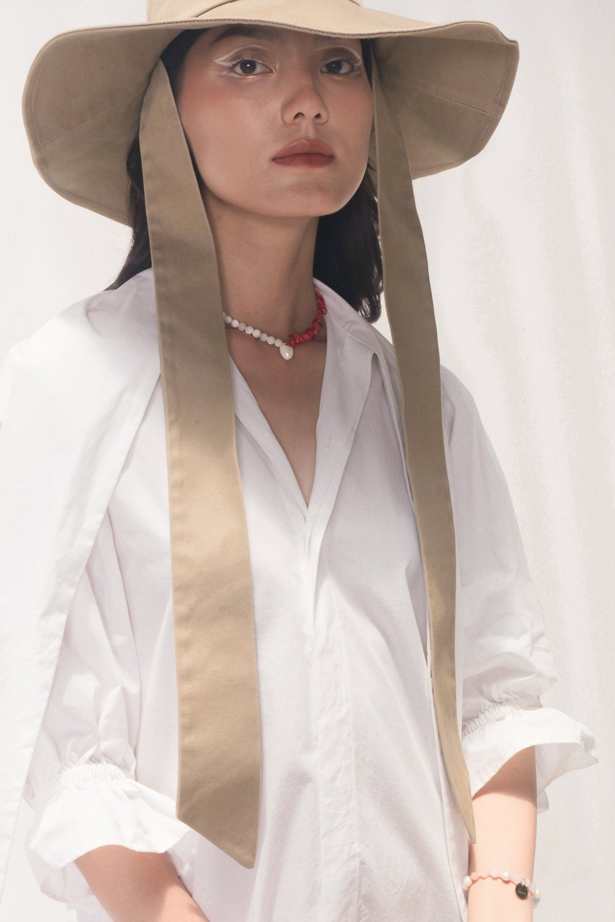 Crafted from a sensual blend of cotton and silk, Sabbia hat whispers of summer freedom. Inspired by the rolling dunes, its crown is a soft, breathable haven for your head. Statement ties lay playfully beneath your chin, while the fabric's natural sheen evokes the sun-kissed glow of endless summer days.
