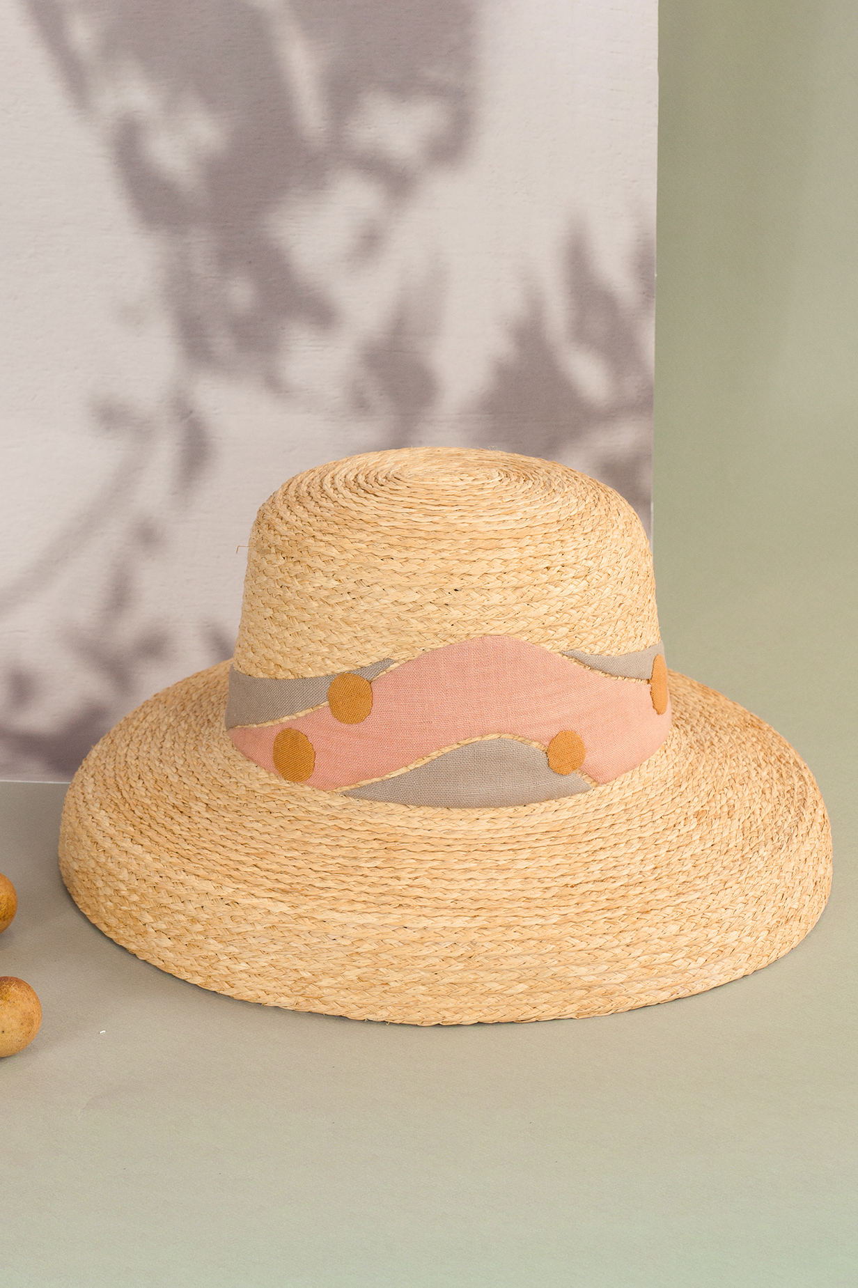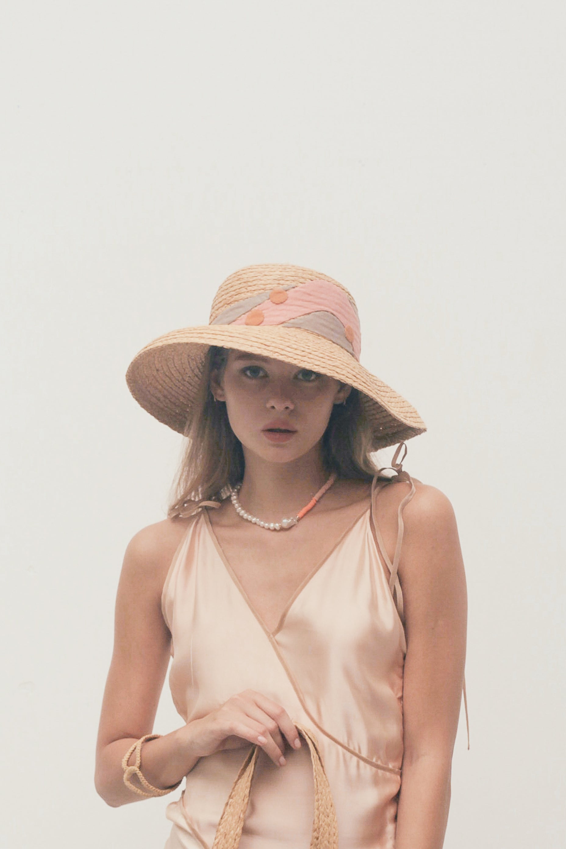 The flexible and lively form of the short and downturn brim of the Clémentine raffia hat can be transformed into two ways of wearing. Upcycled cotton fabric details mischievously embraces the hat, with the mixture of 3 warm colors from the Leinné garden under the golden sunshine.