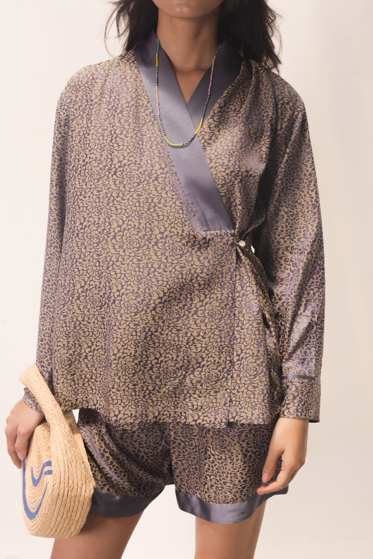 Cette association évoque un sentiment de liberté et d'intimité. Le kimono en soie offre une superposition fluide, idéale sur un maillot de bain ou un short léger, tandis qu'un sac original ajoute une touche de l'intention.Un ensemble qui vous suit des bords de piscine aux dîners spontanés sous les étoiles, avec confort et présence poétique.