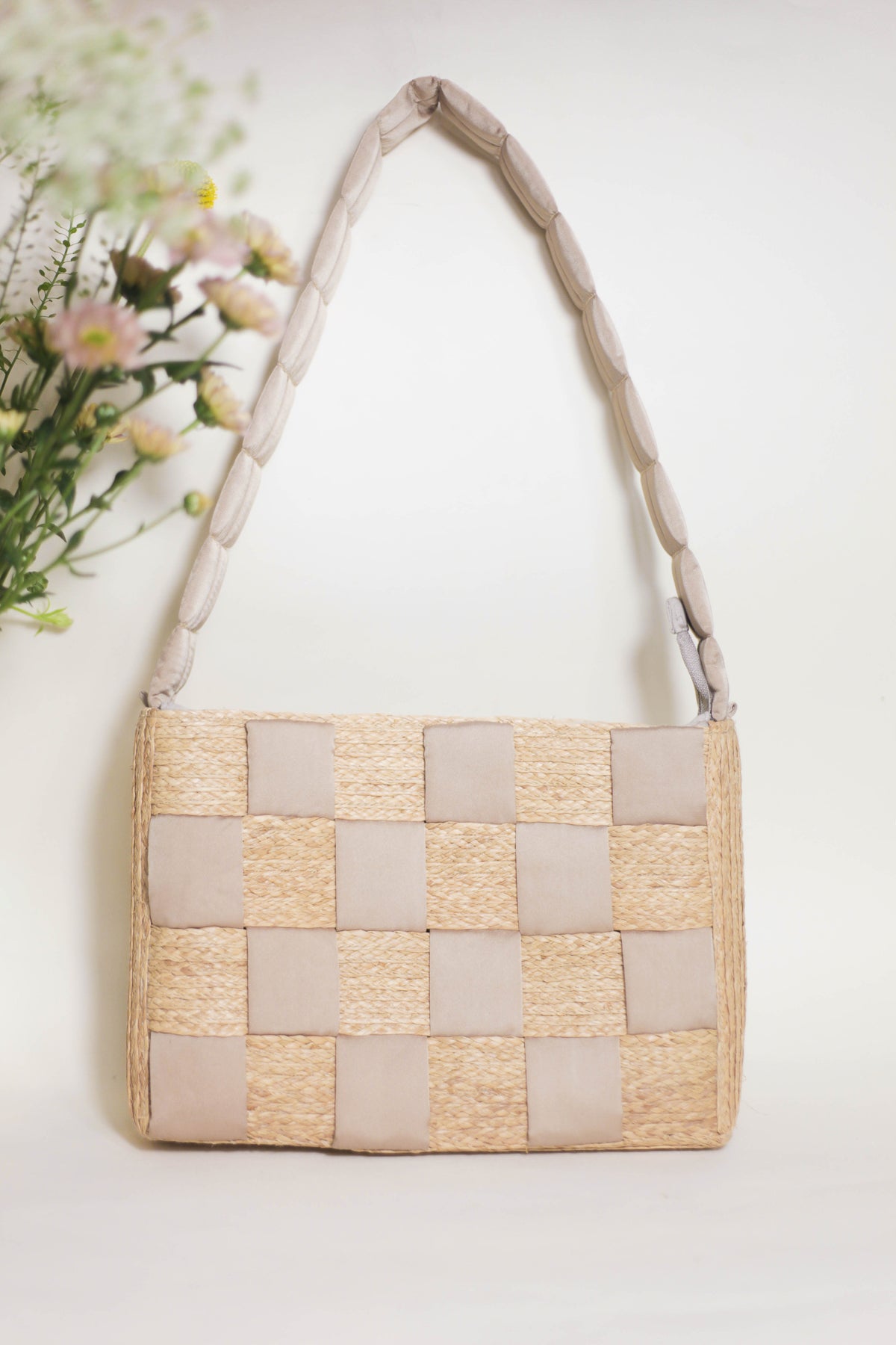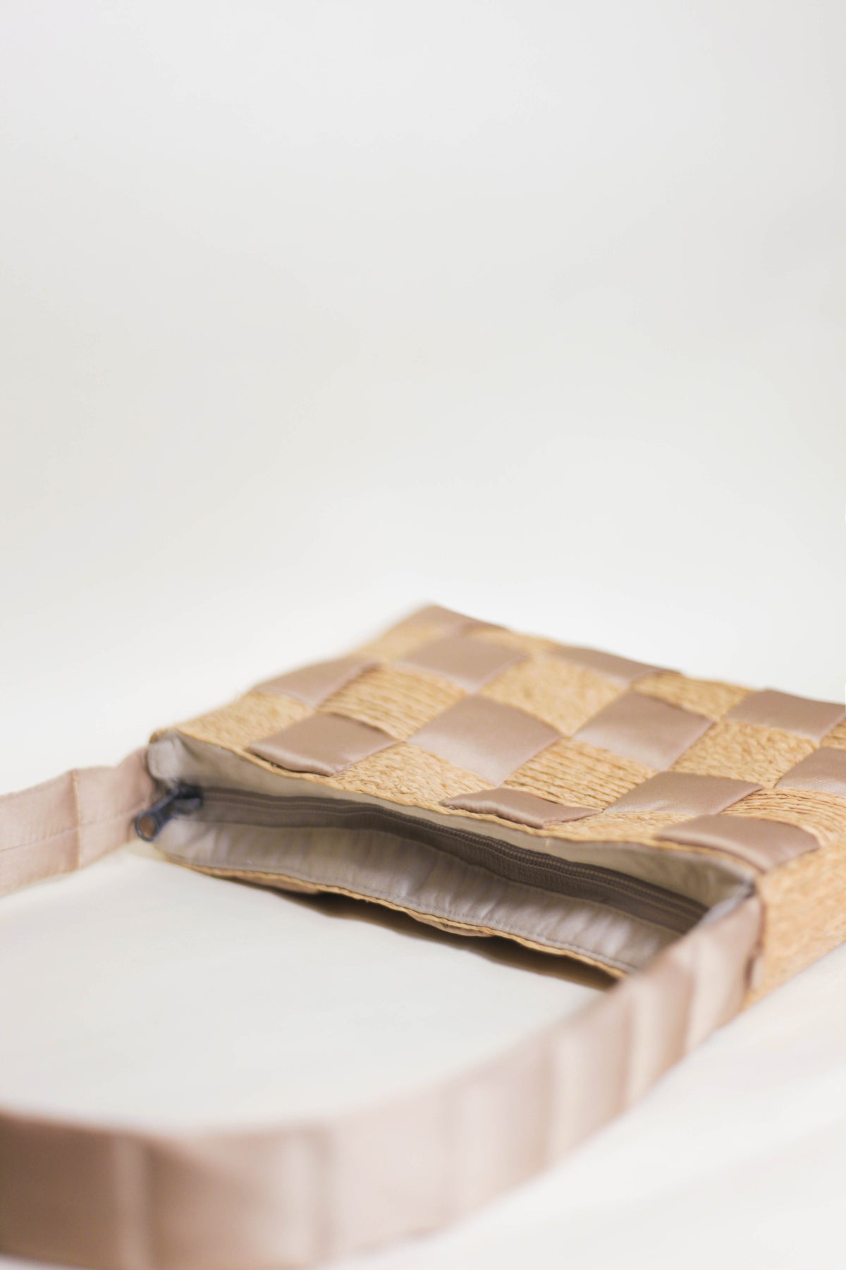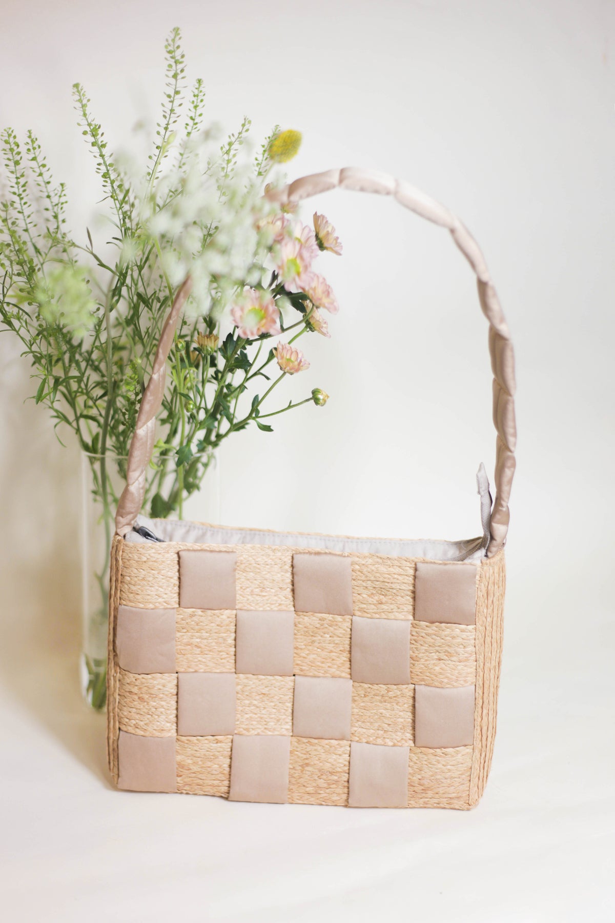 Silk and raffia blends sensually in this handbag. The body reflects the refined craftsmanship of interlacing silk and raffia in a chess pattern, while the handle is crafted from silk with quilted pattern. The compact silhouette and detachable silk strap complete this design.