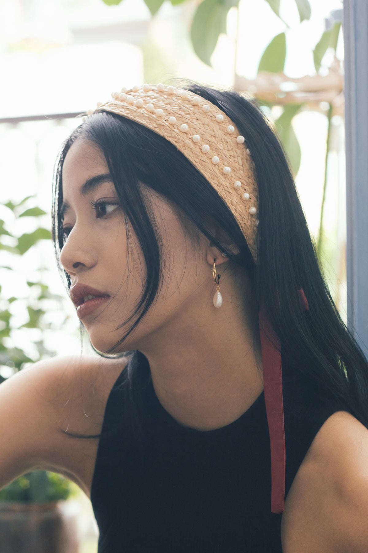 A romantic and ethereal headpiece, Leinné Pearl Lover headband is a sleek design made from natural raffia and adorned with pearls. We add extra elegance and thoughtfulness with a long strand silk ribbon at the back that is adjustable to your head.