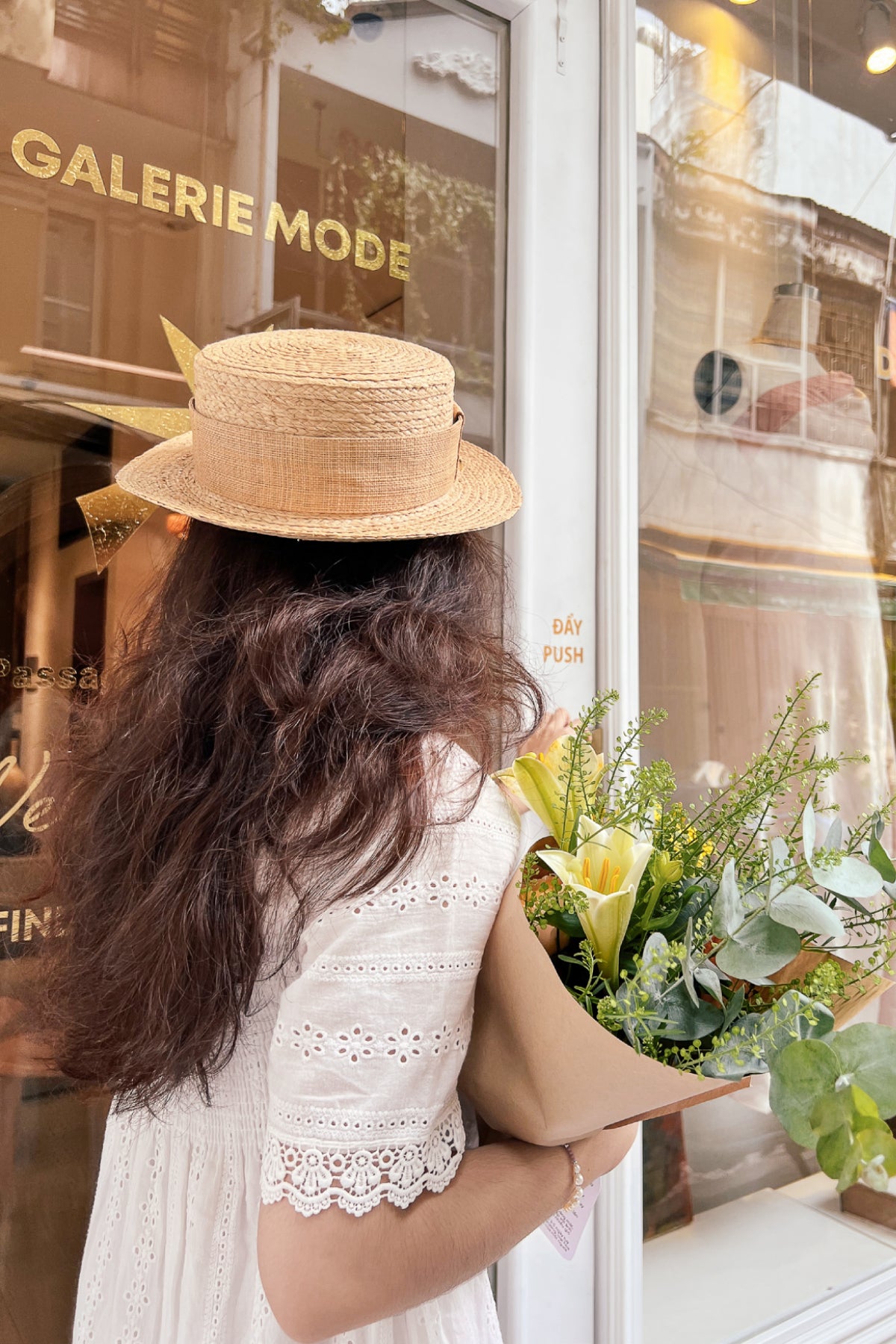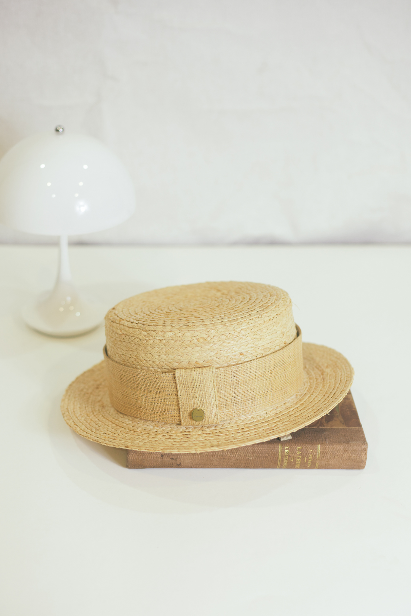 Từ dáng nón boater của các quý ông cuối thế kỉ 19 - biểu tượng của sự tự do, phóng khoáng, thiết kế nón James được ra đời với hai phiên bản: raffia tự nhiên và raffia đen. Dáng nón với chỏm thấp và vành ngắn mang âm hưởng của miền quê, đồng thời cũng có nét sang trọng. Nón James phù hợp để các quý cô kết hợp cùng váy suông đơn giản nữ tính hay áo blazer và quần vải mềm cho phong cách cá tính hơn. Dải ruy băng trang trí được làm vải cotton mềm, mang màu sắc hài hòa với phần thân raffia và tạo nên điểm nhấn với đồng xu bằng kim loại.