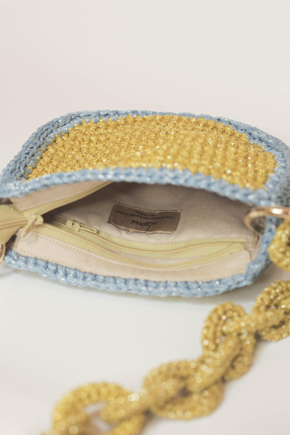 Phiên bản mini của chiếc túi Madeleine là thiết kế hoàn hảo để đưa sức sống của màu sắc vào bộ trang phục. Lấy cảm hứng từ những màu sắc vui tươi của những tiệm bánh ở Paris, thiết kế đưa bạn đến những ngày hè rực rỡ và tràn đầy niềm vui. Những sợi len lấp lánh màu vàng và xanh lam bắt ánh nắng, tạo hiệu ứng lung linh theo từng bước đi.