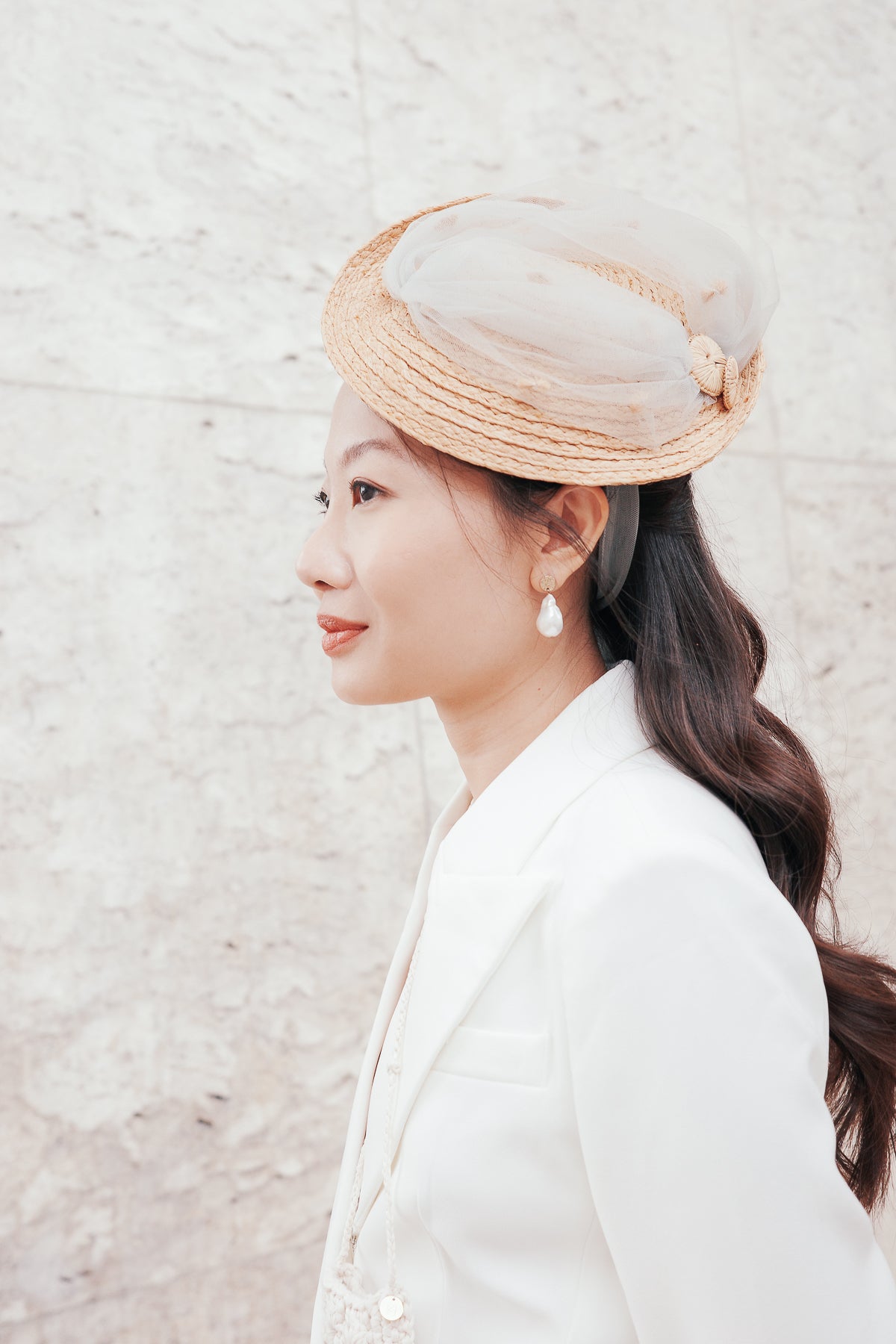 Bianca mang nguồn cảm hứng mộng mơ cùng phom dáng của nón dạ tiệc. Thân nón bằng chất liệu raffia tự nhiên được phủ bởi lớp lưới bồng bềnh tạo điểm nhấn lãng mạn. Phối thiết kế với chiếc váy dạ hội dài cho một buổi tiệc đêm giữa lòng thành phố.