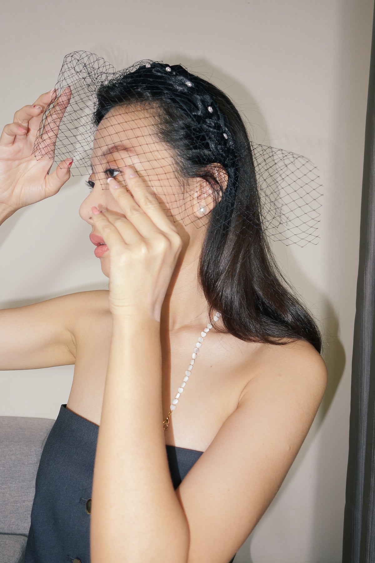 Băng đô Love màu đen với lưới che mặt và ngọc trai